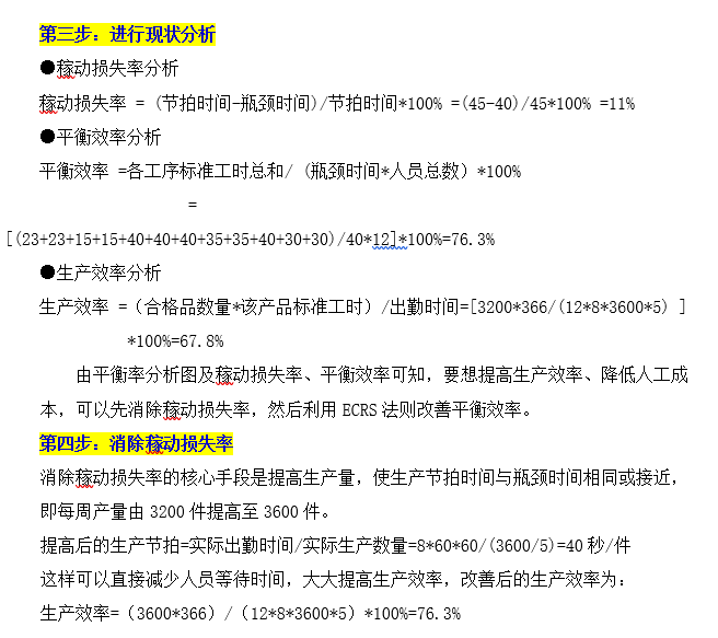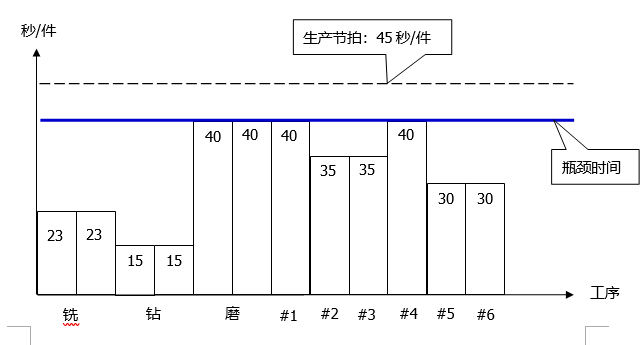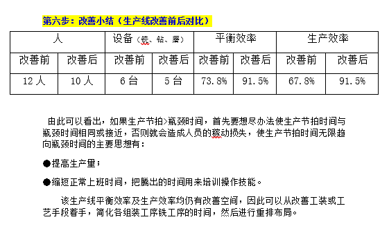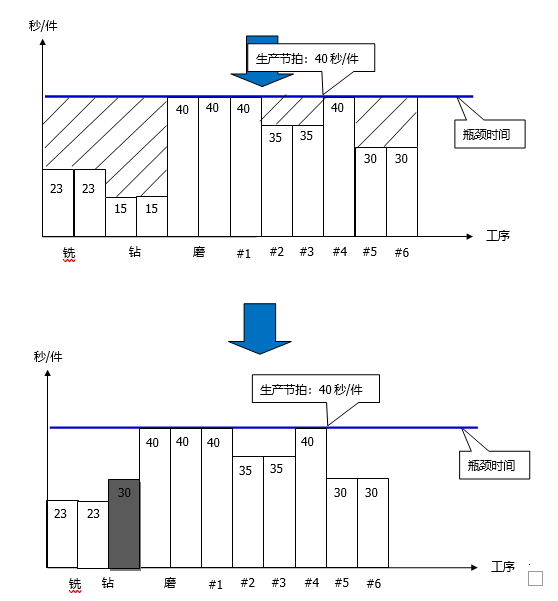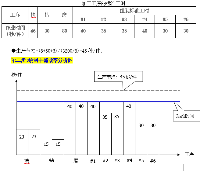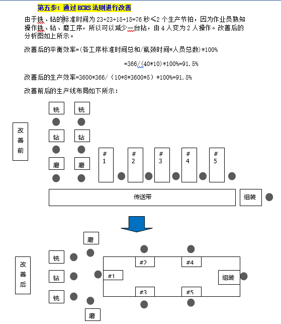 該廠某系列產(chǎn)品的加工工藝流程為銑→鉆→磨→組裝。該車間實(shí)行5天8小時(shí)工作制,每周的產(chǎn)量為3200件。該加工廠生產(chǎn)線平衡改善如下: