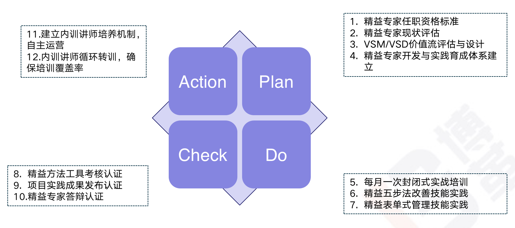 將精益的理念、行為、機制、方法、工具等融入到精益五步法中,能系統(tǒng)地提升科長、經理級人員的精益專家,使其在工作崗位中能從面的角度逐層分析,發(fā)現(xiàn)改善機會;確定實施策略并調整相關資源,從而制定計劃并實施,提升整體效率最終標準化人員的思維和行為。