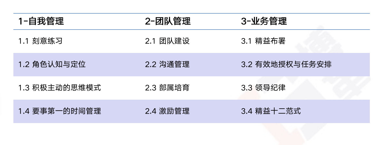 將管理者所應具備最基本的理念、態(tài)度、原則與技法,匯總成【自我管理】、【團隊管理】、【業(yè)務管理】三大模塊,讓其知曉日常管理方法與原則間的差距,了解管理的弱點及偏差,掌握系統(tǒng)的全套管理方法和工具,從而重整自己的管理經驗