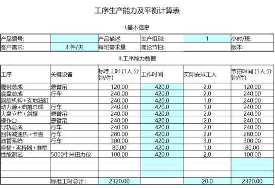 平衡率=【單件標(biāo)準(zhǔn)時(shí)間總和÷(瓶頸時(shí)間X工位總數(shù))】×100%==2630 ÷(720X15)X100%=24.35%。