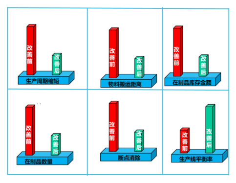 生產線的升級解決了孤島式批量生產的方式,實現了連續流生產模式,在線庫存金額從60萬降為10萬,在制品從50000件降至5000件。車間在建設連續流生產方式時,遵循精益生產思想,通過連續流生產、ECRS工序改善培養多能工、使用自働化工裝等方式,逐步實現對原有生產模式的升級改造。項目取得了較好的效果。