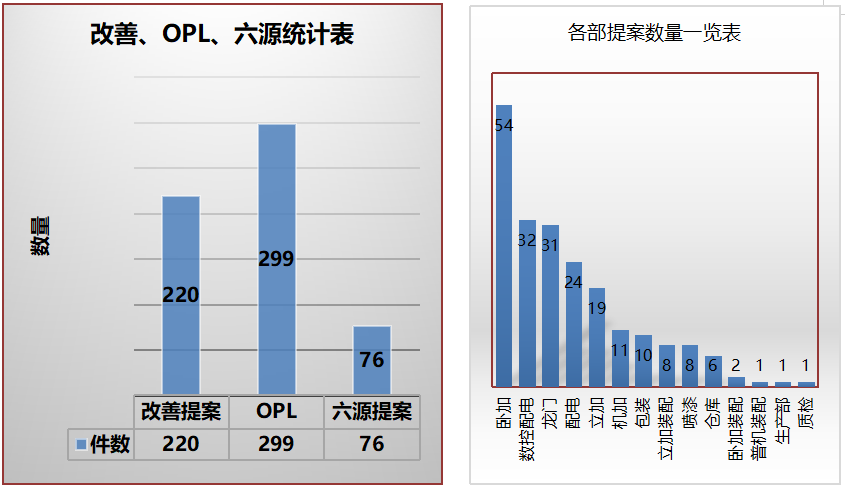 2.全員改善、OPL、六源分析,完成各類改善共595件,其中OPL299個,六源提案76個,提案改善獲獎情況從量向質轉化