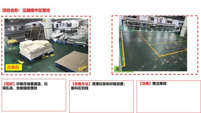 隨后,對所有物品實施“三定”管理:定置(確定存放位置)、定容(明確容器和容量)、定標示(標識清晰易辨)。通過系統整頓,不僅優化了工作流程,還大幅提高了物料和工具的取用效率。全員積極參與改善活動,累計完成現場改善500項,包括工具擺放合理化、通道暢通化、區域功能明確化等,為后續6S深化打下了堅實基礎。