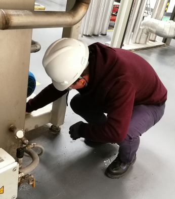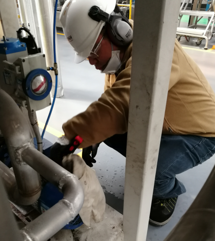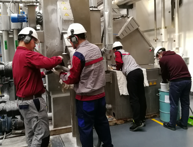 安全培訓完成之后,發放PPE,大家邁著矯健的步伐開赴生產現場,離心甩干機旁。各個小組正在集合各自組員。