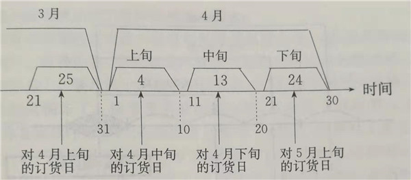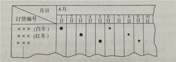 步驟1 來(lái)自銷售商的旬訂貨,各銷售商在汽車廠基本生產(chǎn)計(jì)劃確定的本月領(lǐng)取輛數(shù)的范圍內(nèi),將最終分規(guī)格的10天份的訂貨在7天至8天前通過(guò)微機(jī)聯(lián)網(wǎng)提供給汽車廠的銷售部門(參看圖1)。所謂最終規(guī)格,就是將剛才講過(guò)的按大分類的規(guī)格的車型,進(jìn)一步通過(guò)對(duì)任選部件(訂貨要求的裝備)的選擇、車的顏色的選擇細(xì)分后的規(guī)格。接著,在生產(chǎn)管理部門按照旬訂貨來(lái)計(jì)劃分工廠,分生產(chǎn)線的日產(chǎn)量,這就是對(duì)前面所講述的基本生產(chǎn)計(jì)劃的修正,另外,豐田汽車公司還要向各家銷售商報(bào)告圖2那樣的配送預(yù)定表( Delivery Schedule),這個(gè)預(yù)定表的編制,從接受旬訂貨開始需要兩天的時(shí)間。