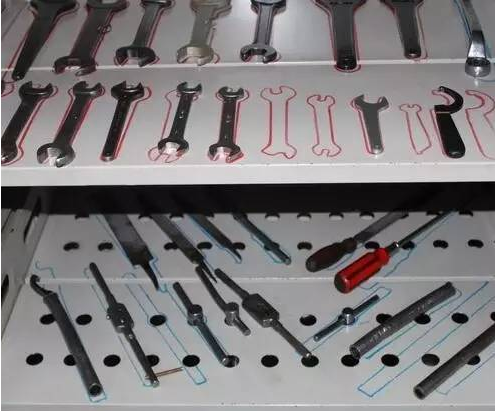 方法3:做成看板展示式或多層推拉式的展示板,下圖為看板展示式的展示板,所有的工具、零件都有固定的位置和標識,采用形跡管理的方式進行管理,查找起來非常方便。